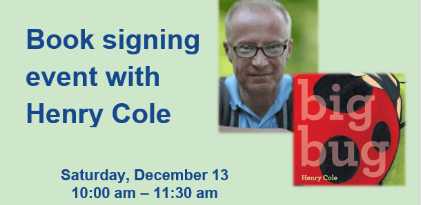 Families and children are invited to enjoy a live read-aloud of Henry Cole’s beloved book, BIG BUG, at 10:30 am followed by a book signing session. Arrive at 10 a.m. for an hour of fun and games and activities before our special guest reads this classic book.