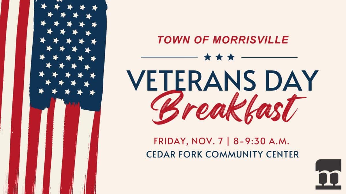 The Town of Morrisville is holding a Veterans Day celebration on Friday, November 7, 2025, from 8 to 9:30 a.m., at Cedar Fork Community Center, 1050 B Town Hall Drive, Morrisville, North Carolina.