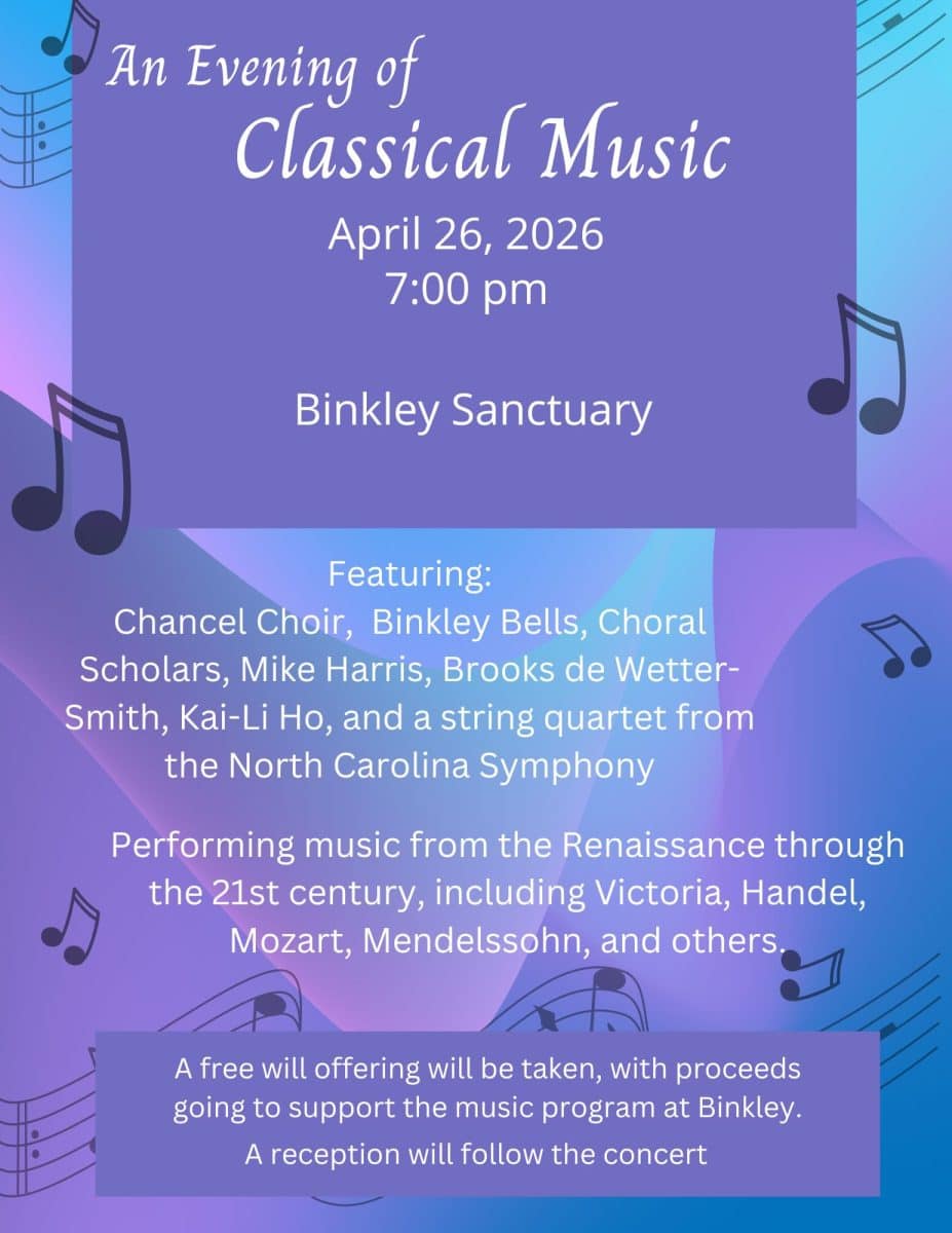 Binkley Baptist Church, 1712 Willow Drive, Chapel Hill, North Carolina, is hosting a free concert on Sunday, April 26, 2026, at 7 p.m.