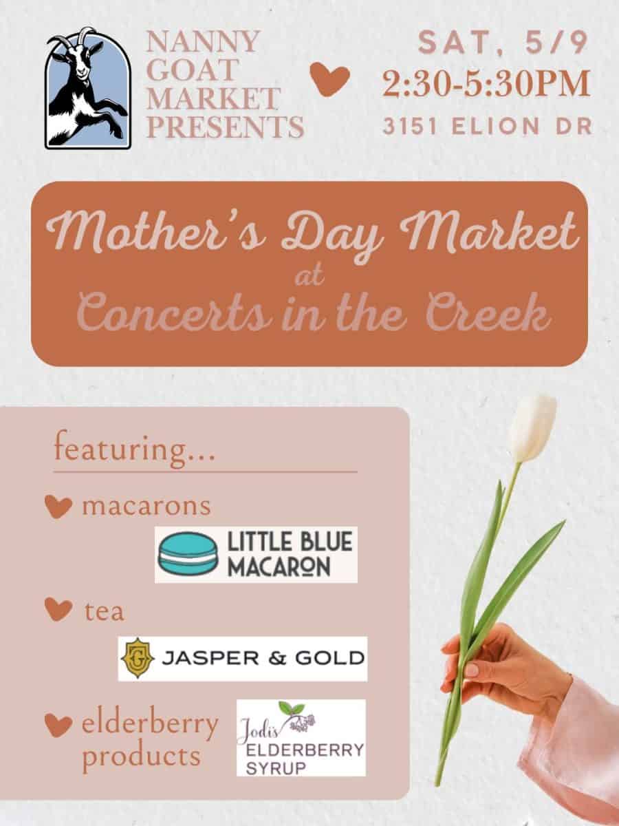 Nanny Goat Market RTP is hosting a Mother’s Day Market on Saturday, May 9, 2026, from 2:30 to 5:30 p.m., at 3151 Elion Drive, Durham, North Carolina.