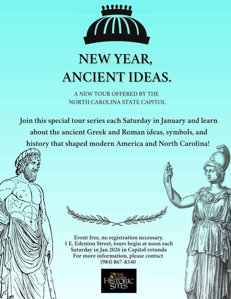 The North Carolina State Capitol is hosting a new tour, New Year, Ancient Ideas, in 2026. On four Saturdays in January, 2026, join a special tour and learn about the ancient Greek and Roman ideas, symbols and history that shaped modern America and North Carolina.