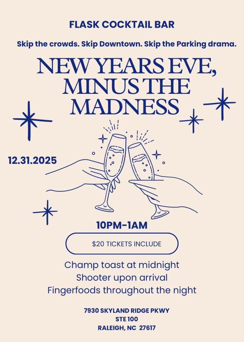 Flask Cocktail Bar, at 7930 Skyland Ridge Parkway, Raleigh, North Carolina, is hosting New Year’s Eve, Minus the Madness. Skip the crowds downtown and relax here!