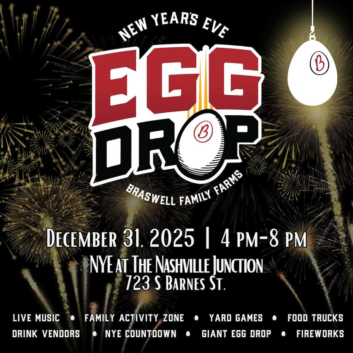 The 3rd Annual Braswell Family Farms New Year’s Eve Egg Drop takes place Wednesday, December 31, 2025, from 4 to 8 p.m., at Nashville Junction, 723 S Barnes Street, Nashville, North Carolina.