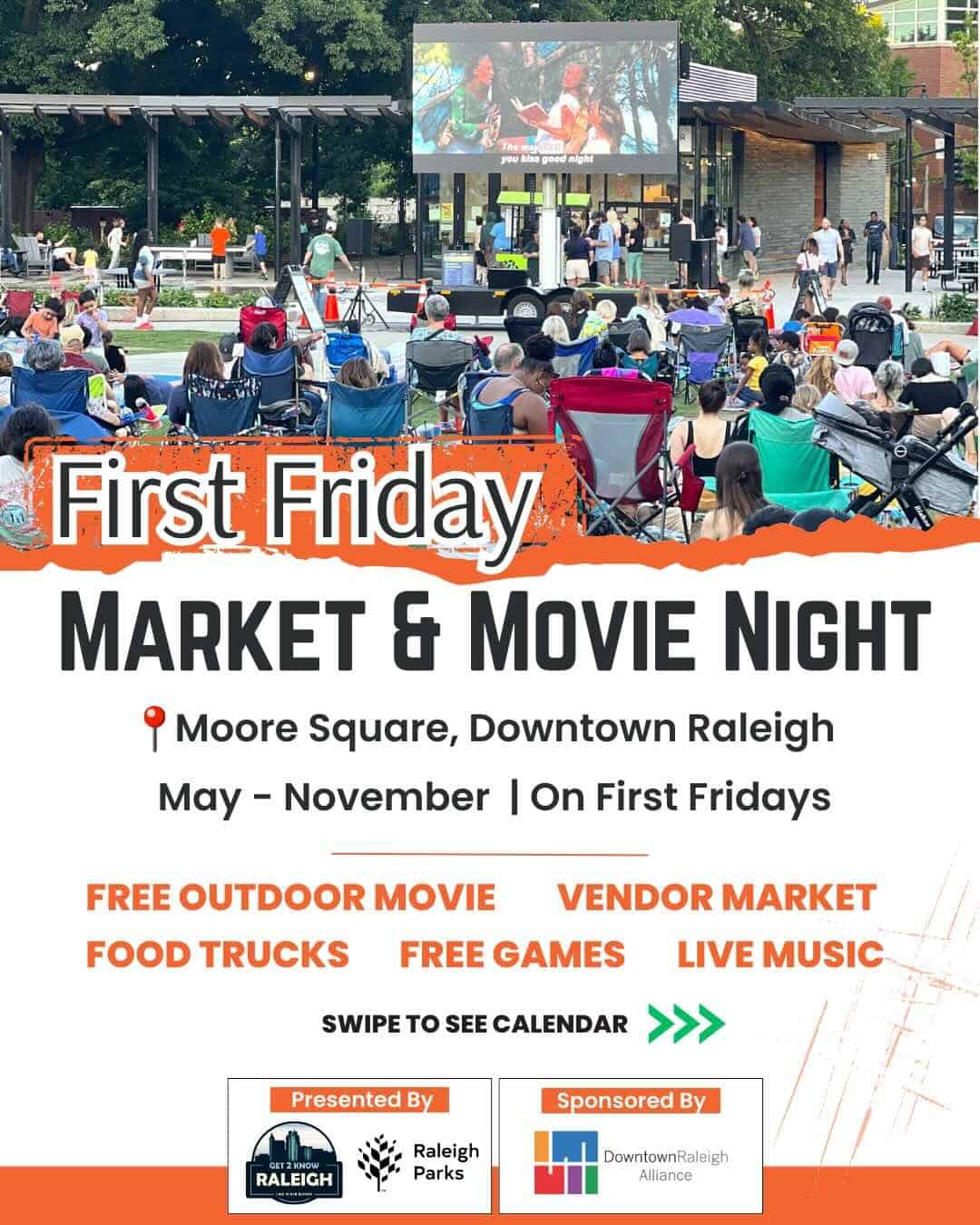 Raleigh Parks and Get 2 Know Raleigh are hosting free outdoor films and markets at Moore Square, 200 S. Blount Street, Raleigh, North Carolina. The events are usually held on the first Friday of the month. If there’s a change in that schedule it’s noted below.