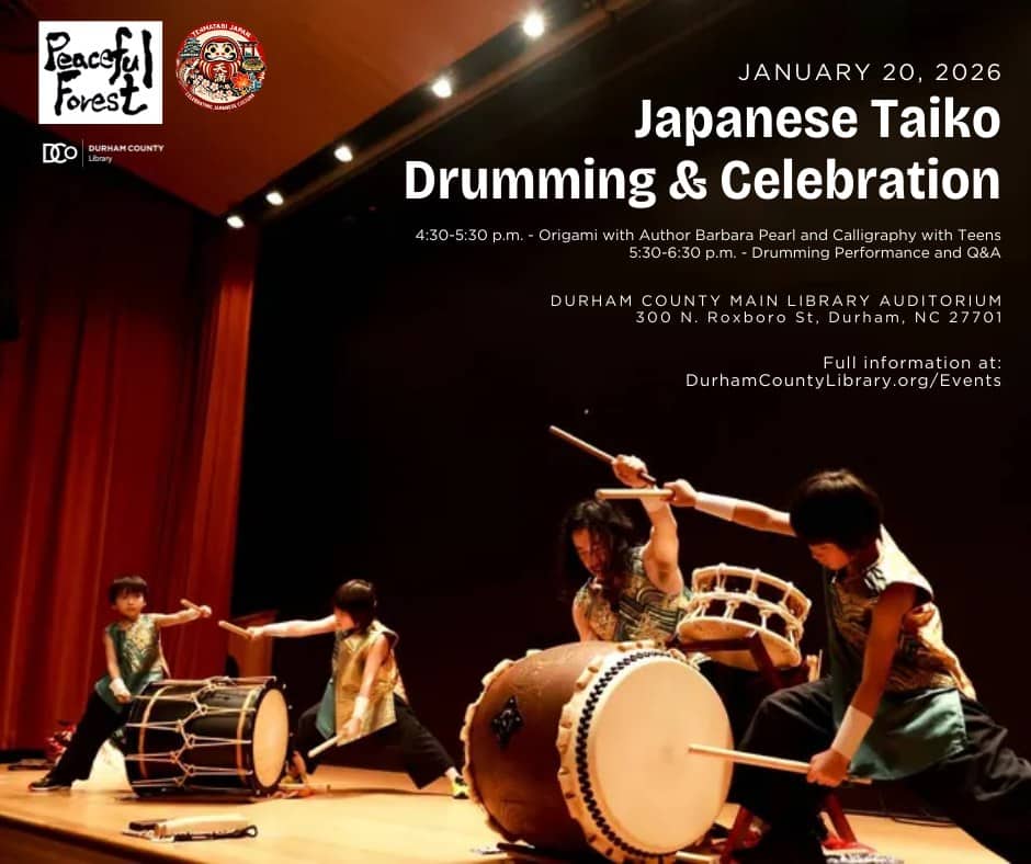 Durham County Main Library, 300 N Roxboro Street, Durham, North Carolina, is hosting Japanese Taiko Drumming and Cultural Celebration on Tuesday, January 20, 2026, from 4:30 to 6:30 p.m.