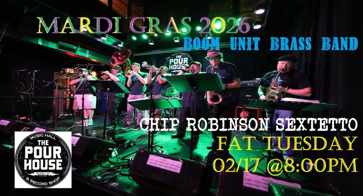 The Pour House Music Hall is hosting a Mardi Gras Party, featuring Boom Unit Brass Band and Chip Robinson Sextetto, on Tuesday, February 17, 2026. Doors are at 7 p.m. and the show is at 8 p.m. Tickets are $14.24, including fees. Purchase tickets here.