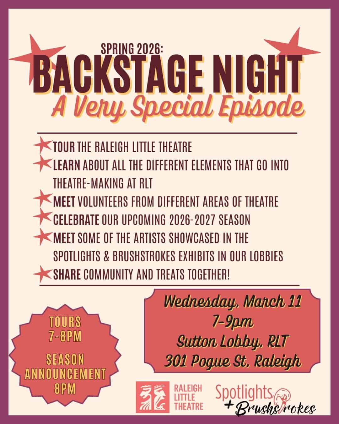 Raleigh Little Theatre, 301 Pogue Street, Raleigh, NC, is holding Backstage Night on Wednesday, March 11, 2026, from 7 to 9 p.m.