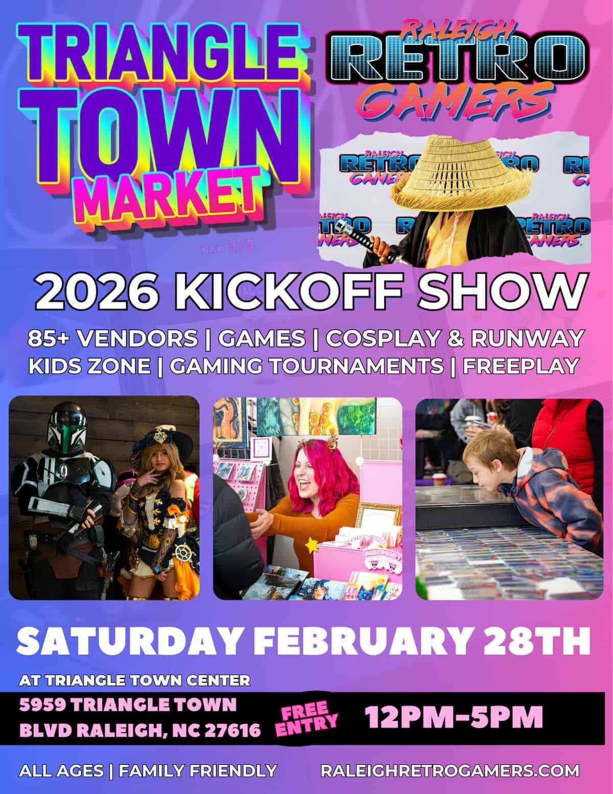 Raleigh Retro Gamers is presenting Triangle Town Market Kickoff Show on Saturday, February 28, 2026, from 12 to 5 p.m., at Triangle Town Center, 5959 Triangle Town Blvd, Raleigh, North Carolina. It’s free to attend.