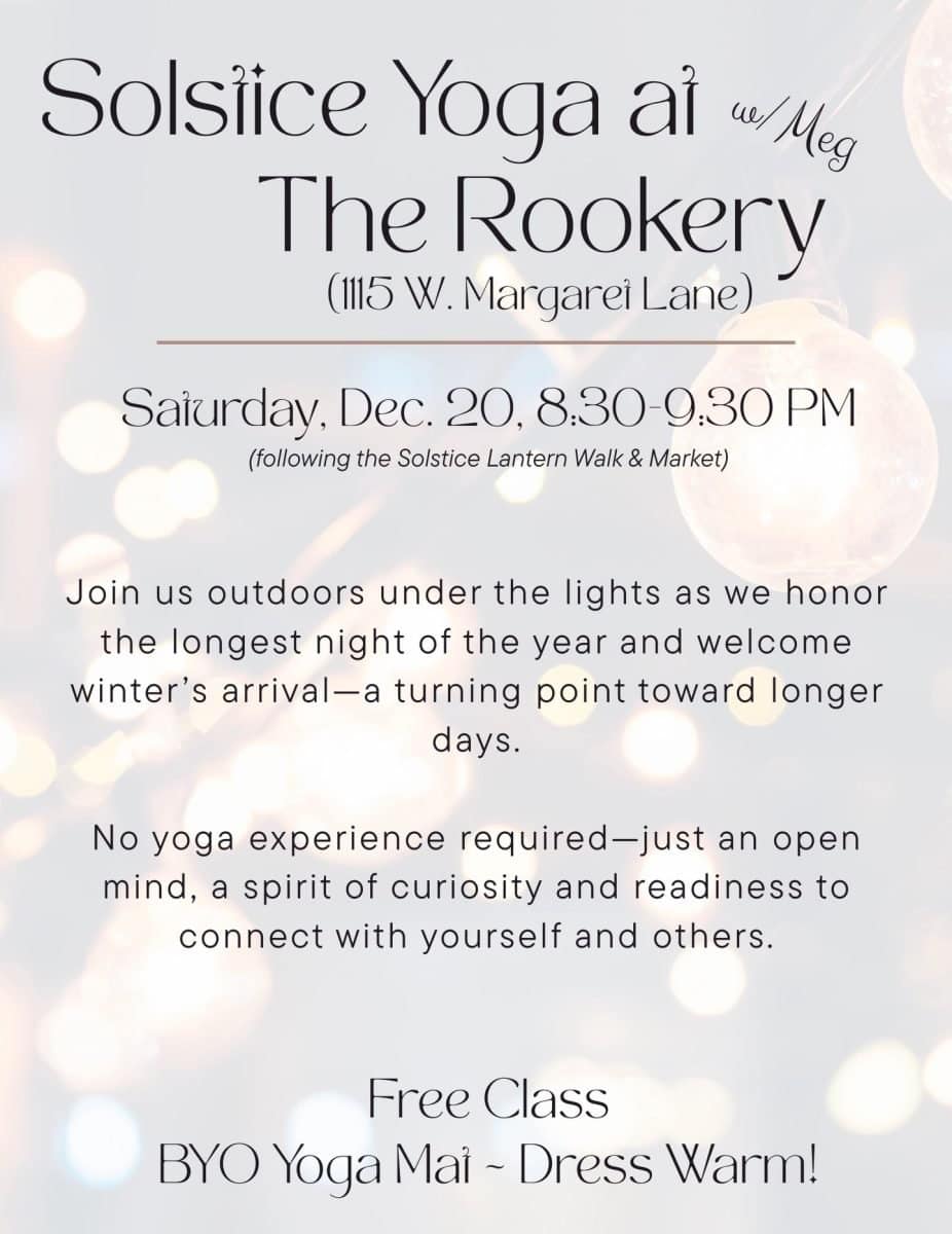 The Rookery, at 115 W Margaret Lane, Hillsborough, North Carolina, is hosting free Solstice Yoga on Saturday, December 20, 2025, from 8:30 to 9:30 p.m. It will take place after the Solstice Lantern Walk and Market.