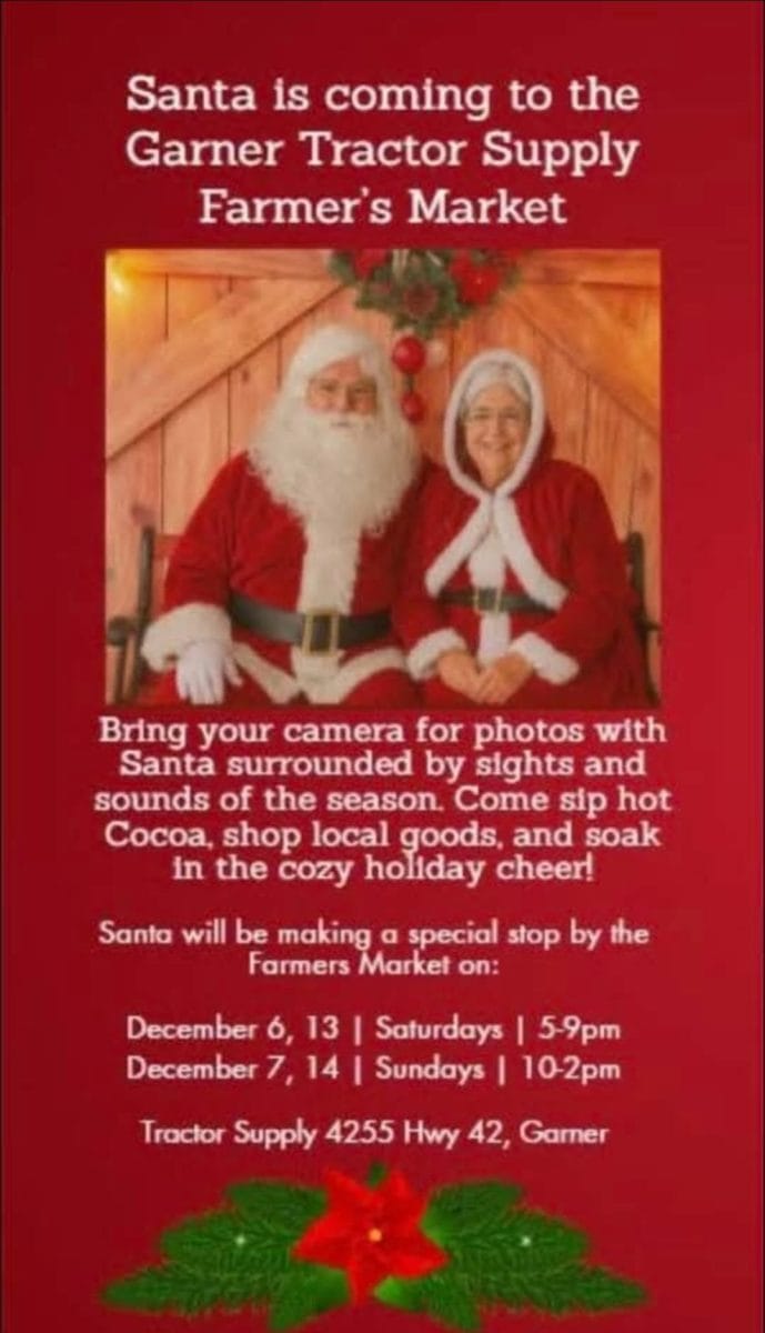 Santa will be at Tractor Supply Garner Parking Lot, 4255 Veterans Parkway, Garner, North Carolina, for free pictures.