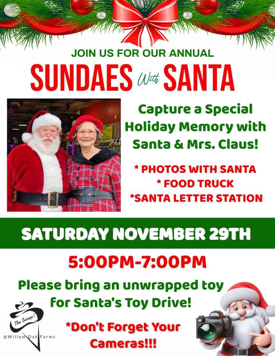 The Scoop at Willow Oak Farms, 1530 Lafayette Road, Fuquay-Varina, North Carolina, is hosting Sundaes with Santa on Saturday, November 29, 2025, from 5 to 7 p.m.