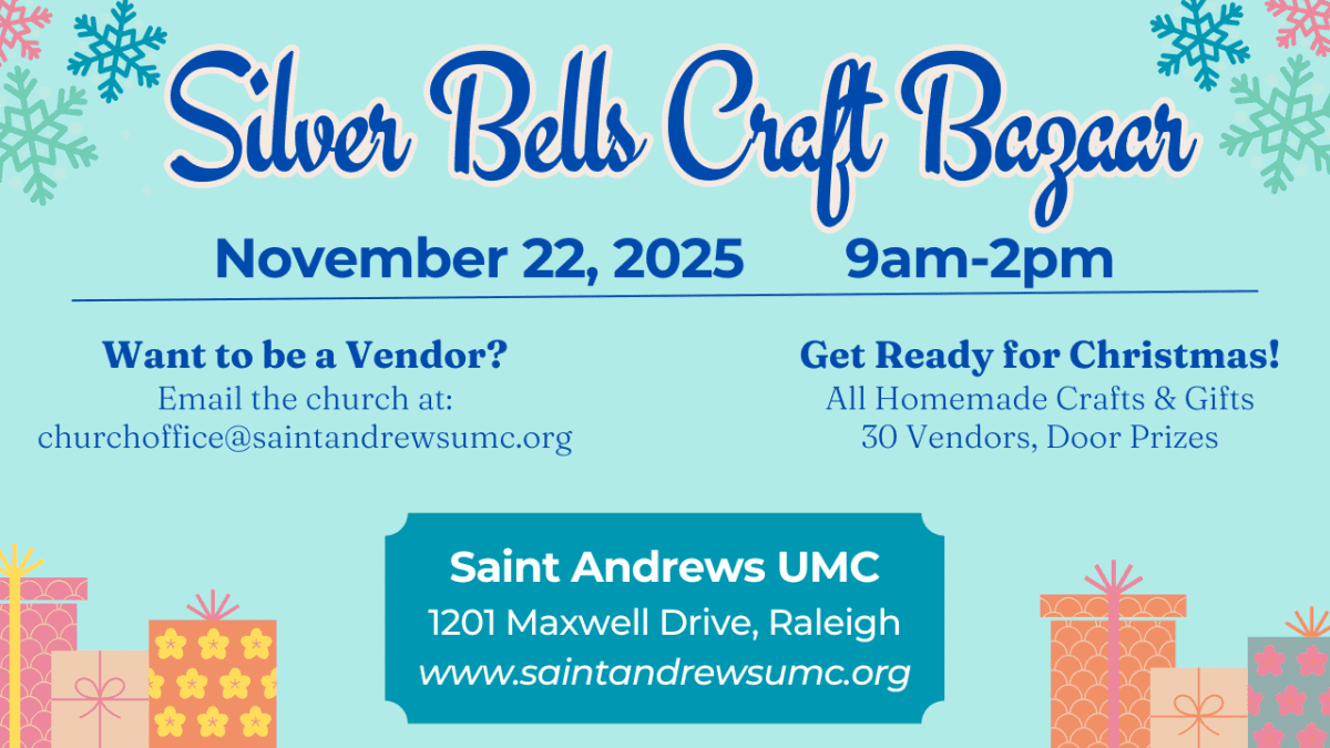 Saint Andrews United Methodist Church, 1201 Maxwell Drive, Raleigh, North Carolina, is hosting Silver Bells Craft Bazaar on November 22, 2025, from 9 a.m. to 2 p.m.