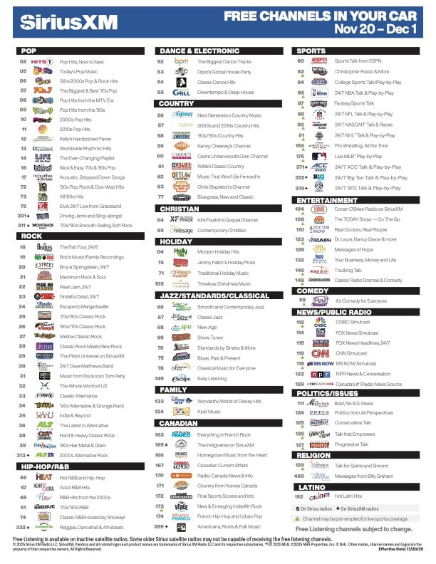 SiriuxSM’s Listen Free Event is available on inactive satellite radios from November 20 to December 1, 2025.
