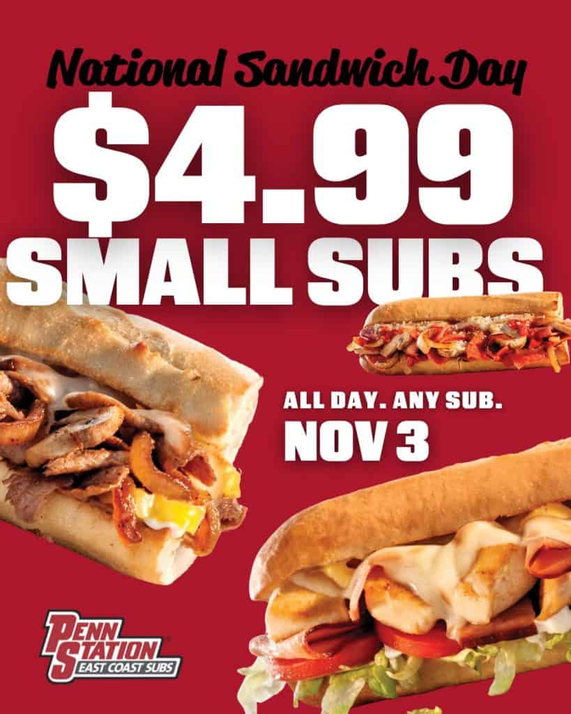 Penn Station East Coast Subs is offering any small sub for $4.99 on November 3, 2025, with the promo code NS25. Participating locations only. Info here.