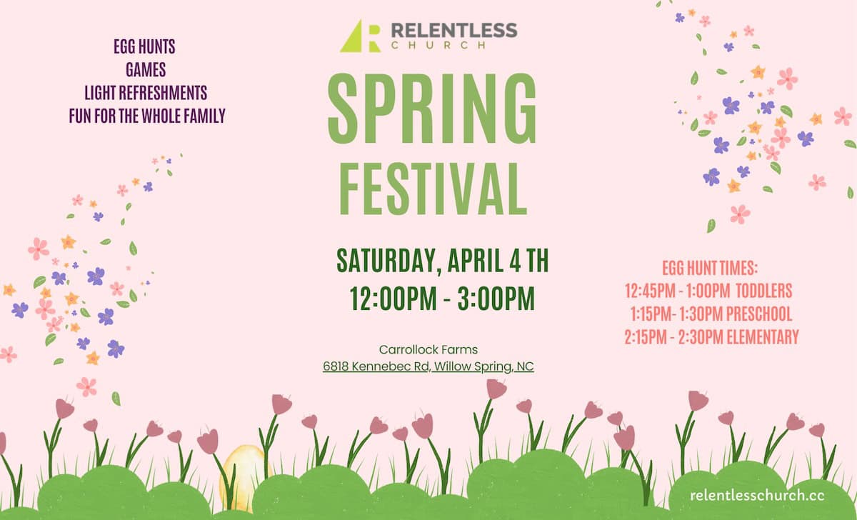 Relentless Church and Carrollock Farms are hosting a Spring Festival on Saturday, April 4, 2026, from 12 to 3 p.m., at Carrollock Farms, 6818 Kennebec Road, Willow Spring, North Carolina.