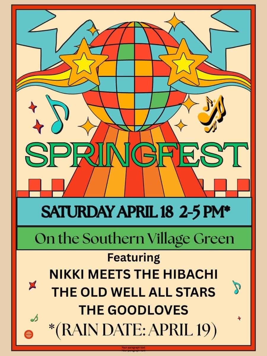 Southern Village, at 620 Market Street, Chapel Hill, North Carolina, is hosting SpringFest on Saturday, April 18, 2026, from 3 to 5 p.m.