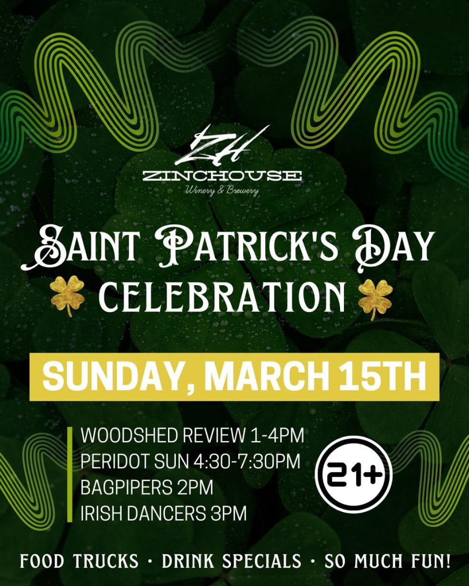 ZincHouse Winery & Brewery, at 6225 Wake Forest Hwy, Durham, North Carolina, is hosting a St. Patrick’s Day celebration on Sunday, March 15 2026, from 12 to 7:30 p.m. It was announced on Facebook.