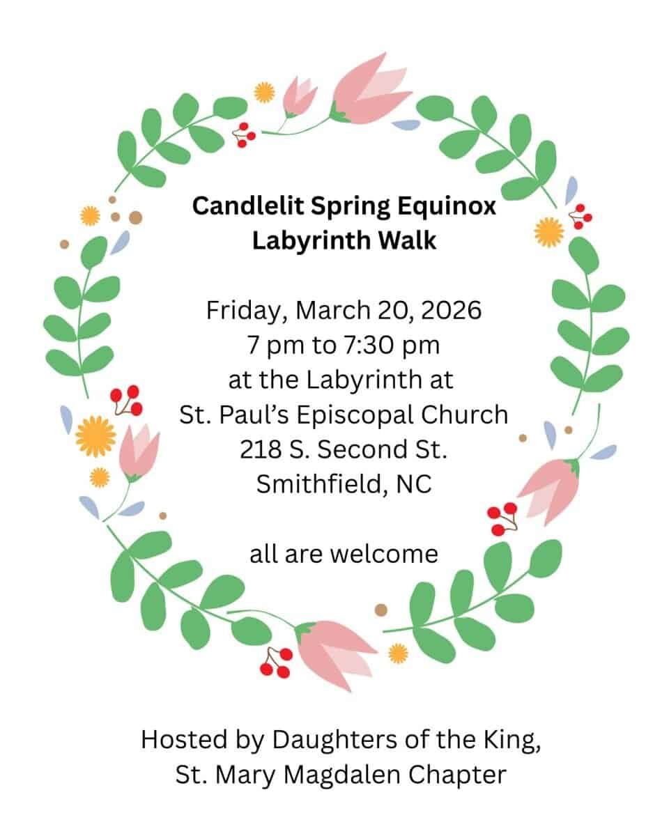 St. Paul’s Episcopal Church, 218 S 2nd Street, in Smithfield, invites the community to a Spring Equinox Labyrinth Walk on Friday, March 20, 2026, from 7 to 7:30 p.m.