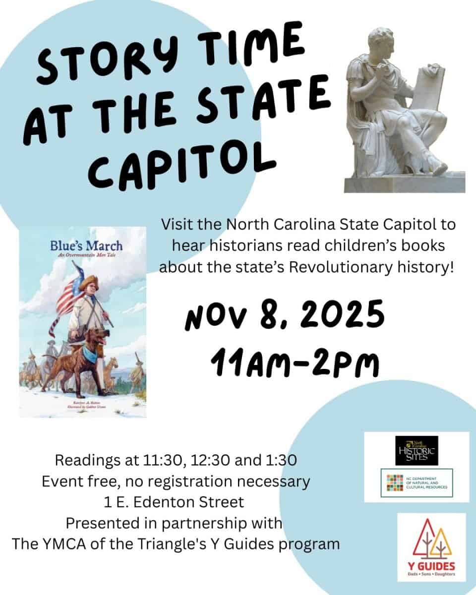 Join the Capitol, 1 E Edenton Street, Raleigh, North Carolina, on Saturday, November 8, 2025, as historians read children’s books about the state’s Revolutionary history.