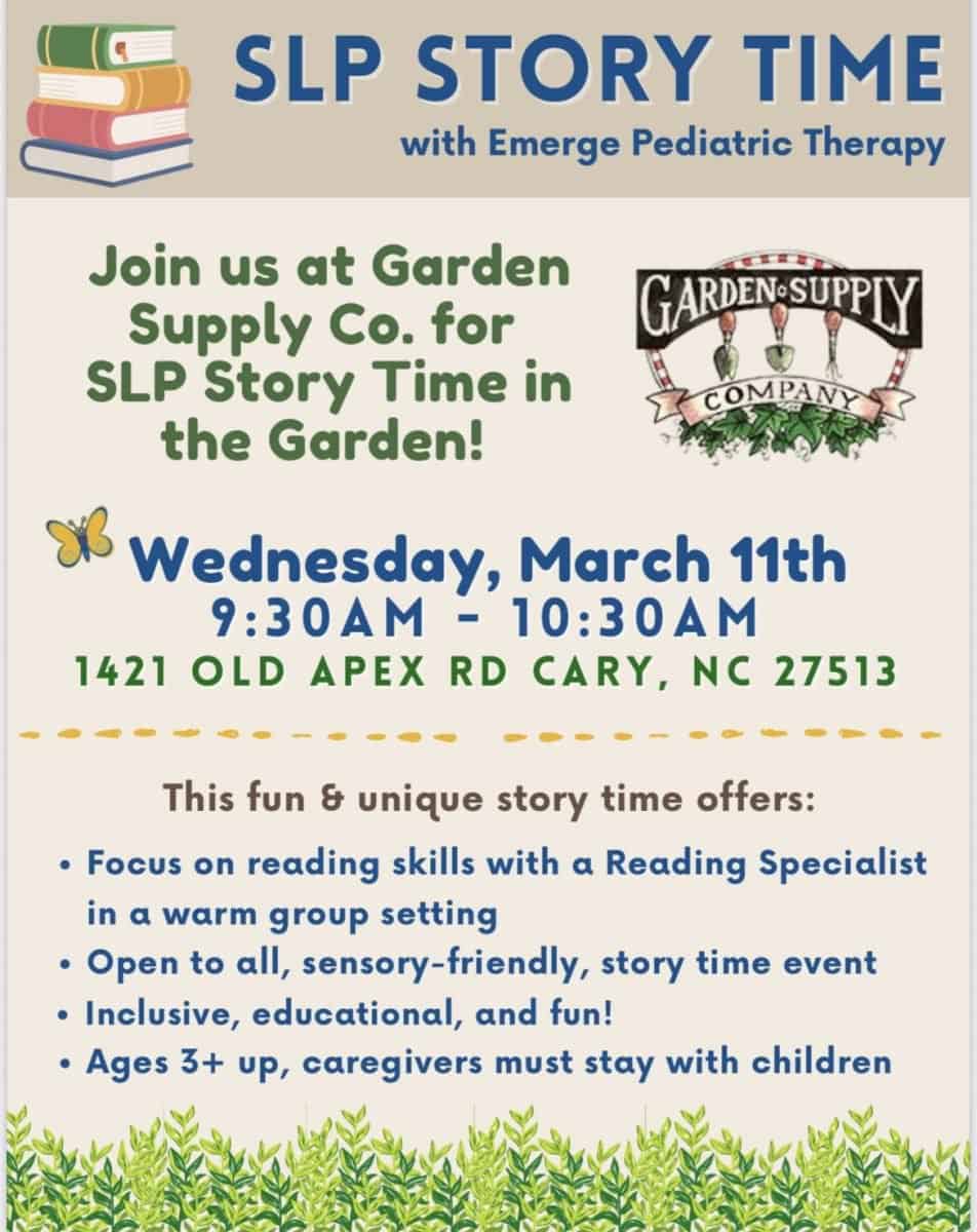 Emerge Pediatric Therapy is offering SLP (Speech Language Pathologist) Storytime at Garden Supply Company, 1421 Old Apex Road, Cary, North Carolina, on Wednesday, March 11, 2026, from 9:30 to 10:30 a.m.