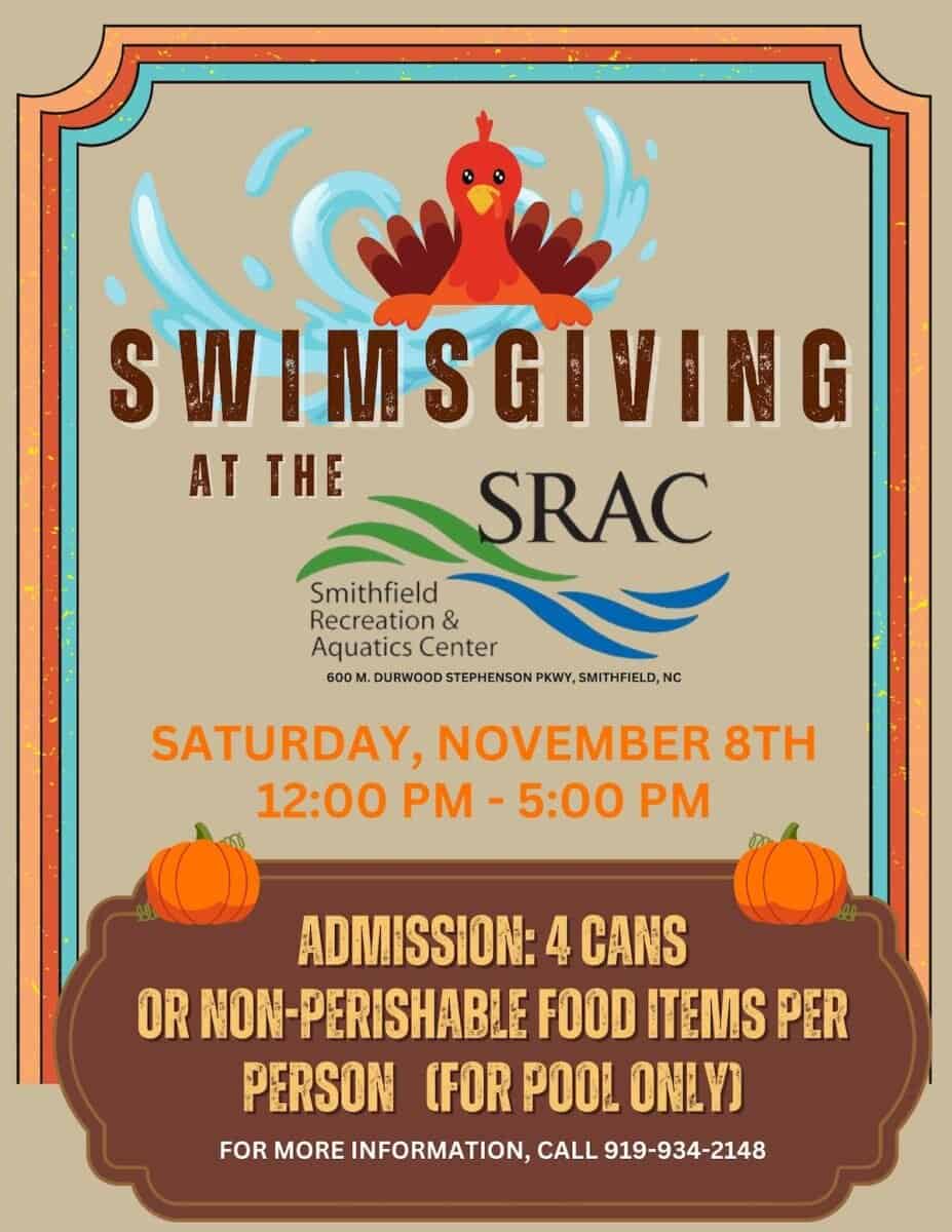 Smithfield Recreation & Aquatics Center, 600 M Durwood Stephenson Pkwy, Smithfield, North Carolina, is hosting Swimsgiving on Saturday, November 8, 2025, from 12 to 5 p.m.