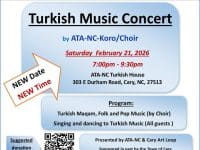 American-Turkish Association NC is presenting a free concert on Saturday, February 21, 2026, from 7 to 9:30 p.m., at ATA-NC Turkish House, 303 E Durham Road, Cary, North Carolina. This is a rescheduled date and time. The program includes: This concert is presented by ATA-NC and Cary Art Loop, and sponsored in part by the Town of Cary Parks Recreation and Cultural Resources Department. Free … [Read more...] about Free Turkish Music Concert in Cary Feb. 21