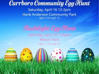 The Town of Carrboro is holding the Carrboro Community Egg Hunt on Saturday, March 28, 2026, from 12 to 2 p.m., at Hank Anderson Community Park, 302 NC Hwy 43 West, Carrboro, NC. This is a free event for kids ages 2-10 years old. There will be three egg hunts: Other activities include face painting and arts and crafts from North Carolina Children's Museum. Bruster's Ice Cream will be there … [Read more...] about Carrboro Community Egg Hunt March 28