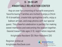 Knightdale Parks, Recreation and Cultural Programs is hosting Bunny Breakfast Bash on Saturday, March 28, 2026, from 9 to 10:30 a.m., at Knightdale Recreation Center, 102 Lawson Ridge Road, Knightdale, North Carolina. Enjoy a delicious breakfast, fun springtime crafts, amazing balloon art, and snap the photos with a special guest. A perfect celebration for the whole family to welcome the season … [Read more...] about Bunny Breakfast Bash in Knightdale on March 28