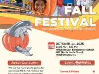 Hillsborough Elementary School, 402 N. Nash Stree, Hillsborough, North Carolina, is hosting a Fall Festival on Saturday, October 11, 2025, from 11 a.m. to 2 p.m. It's free to attend and open to all. The festival features: … [Read more...] about Hillsborough Elementary School Fall Festival Oct. 11 — includes touch-a-truck