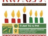 The Town of Carrboro is hosting a Kwanzaa celebration on Saturday, December 27, 2025, from 11 a.m. to 4 p.m., at Drakeford Library Complex, 203 S Greensboro Street, Carrboro, North Carolina. This is a FREE event. The Kwanzaa celebration will honor the rich cultural heritage and enduring spirit of the African American community. This joyous gathering will feature live performances, … [Read more...] about Kwanzaa Celebration in Carrboro Dec. 27