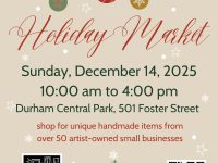 On Saturday mornings, from 9 a.m. to 12 p.m., head to Durham Central Park, 501 Foster Street, for Durham Craft Market. Make sure to check the Facebook page to see if there have been any changes. This outdoor market features local crafts. All artisans live and craft no more than 30 miles from Durham city limits. It's free to attend. Durham Craft Market is also a special event with … [Read more...] about Durham Craft Market Holiday Market at Durham Central Park Dec. 14