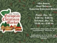 The 18th Annual St. Nicholas European Christmas Market takes place Friday, December 12, 2025, from 5 to 9 p.m., and Saturday, December 13, 2025, from 10 a.m. to 5 p.m., at the Kerr Scott Building at the NC State Fairgrounds, 1025 Blue Ridge Road, Raleigh, North Carolina. Admission is free, but donations are appreciated. The event is a fundraiser by Sts. Cyril and Methodius Byzantine … [Read more...] about 18th Annual St. Nicholas European Christmas Market Dec 12-13