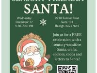 Bloomwell Autism Therapy, 2910 Sumner Road, Suite 101, Raleigh, North Carolina, is hosting Cookies & Cocoa with Sensory-Friendly Santa on Wednesday, December 17, 2025, from 5:30 to 7:30 p.m. Meet Santa, and enjoy crafts, cookies and letters to Santa. This is a sensory-friendly event. Everyone is welcome. … [Read more...] about Cookies & Cocoa with Sensory-Friendly Santa Dec. 17