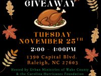 Urban Ministries of Wake County is hosting a Thanksgiving Turkey Giveaway on Tuesday, November 25, 2025, from 2 to 4 p.m., (or while supplies last) at 1390 Capital Blvd, Raleigh, North Carolina. This is a FREE drive-thru event, held with support by the Carolina Hurricanes Foundation. The organization announced the giveaway on their Facebook page. … [Read more...] about Urban Ministries of Wake County hosting turkey giveaway Nov. 25