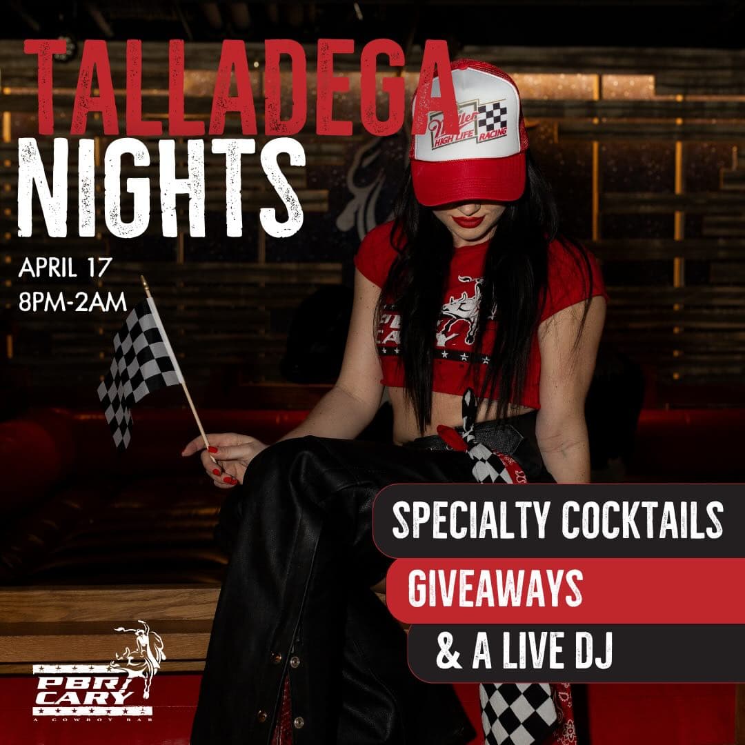 PBR Cowboy Bar, at 301 Fenton Gateway Drive, Cary, North Carolina, is presenting Talladega Nights on Friday, April 17, 2026, from 8 p.m. to 2 a.m.