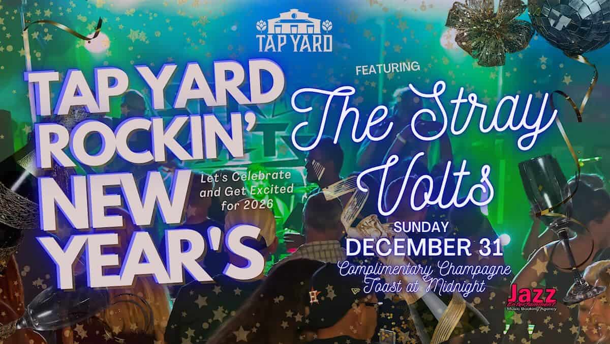 Tap Yard’s Rockin’ New Year’s Eve takes place on Wednesday, December 31, 2025, starting at 7 p.m. It features live music from The Stray Volts, and a free champagne toast at midnight (for 21+.)