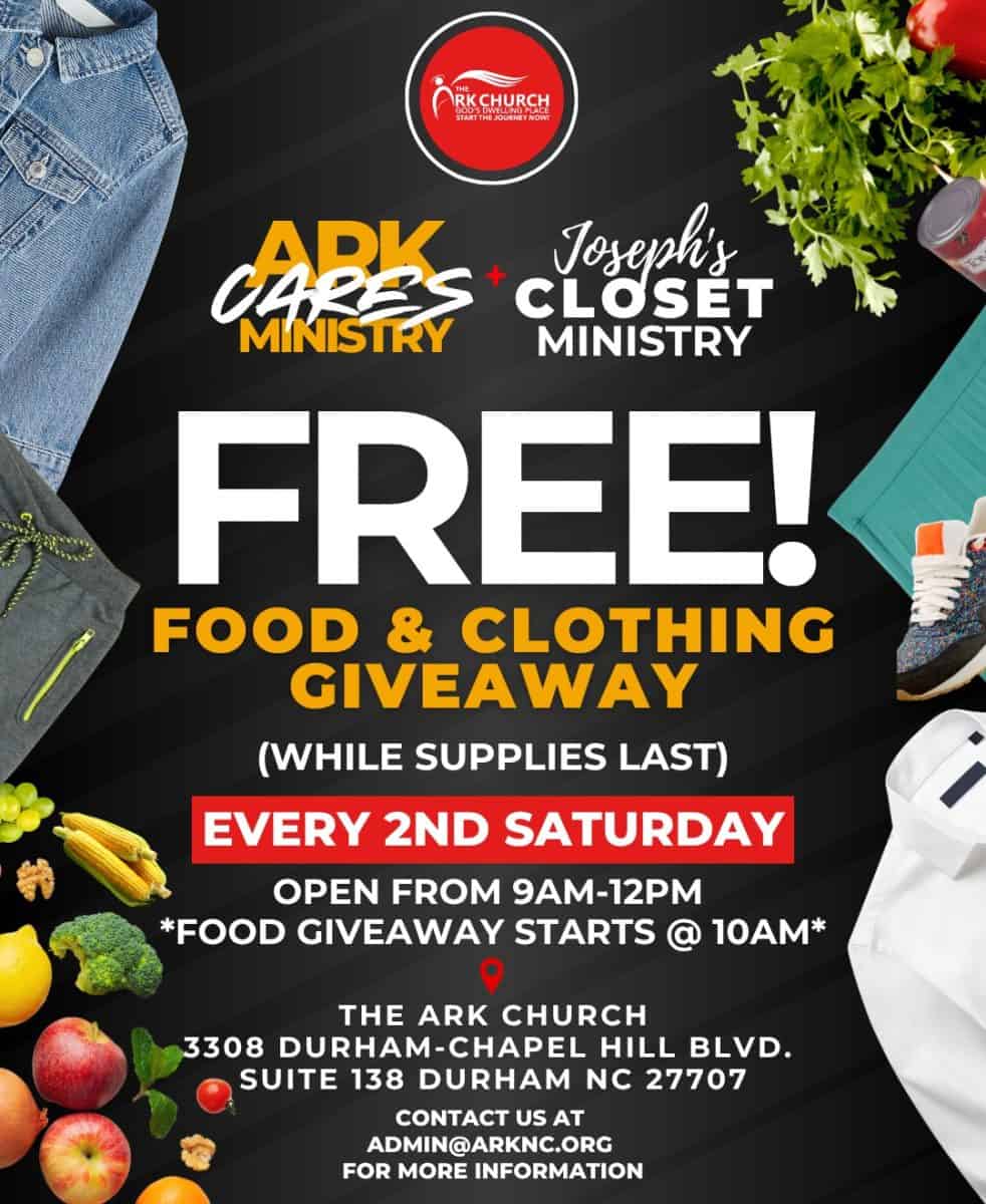 The Ark Church, 3308 Durham-Chapel Hill Blvd, Durham, Suite 138, Durham, North Carolina, host a food and clothing giveaway once a month, on the 2nd Saturday of the month. Make sure to check on The Ark Church’s Facebook page for any changes.