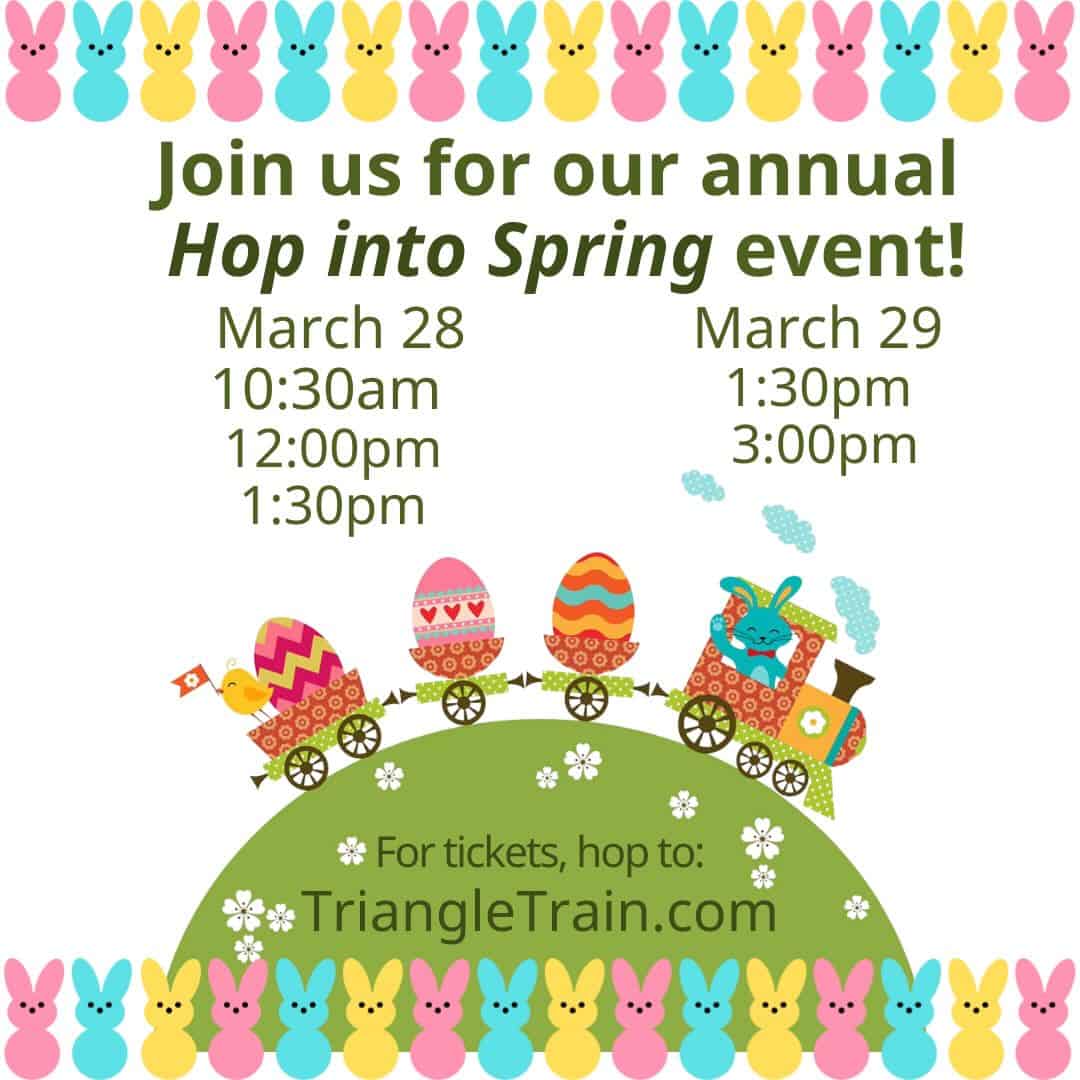 New Hope Valley Railway, 3900 Bonsai Road, New Hill, is offering its annual Hop Into Spring rides on March 28 and 29, 2026. This is a chance to celebrate all things spring, with a train ride behind the historic locomotive.