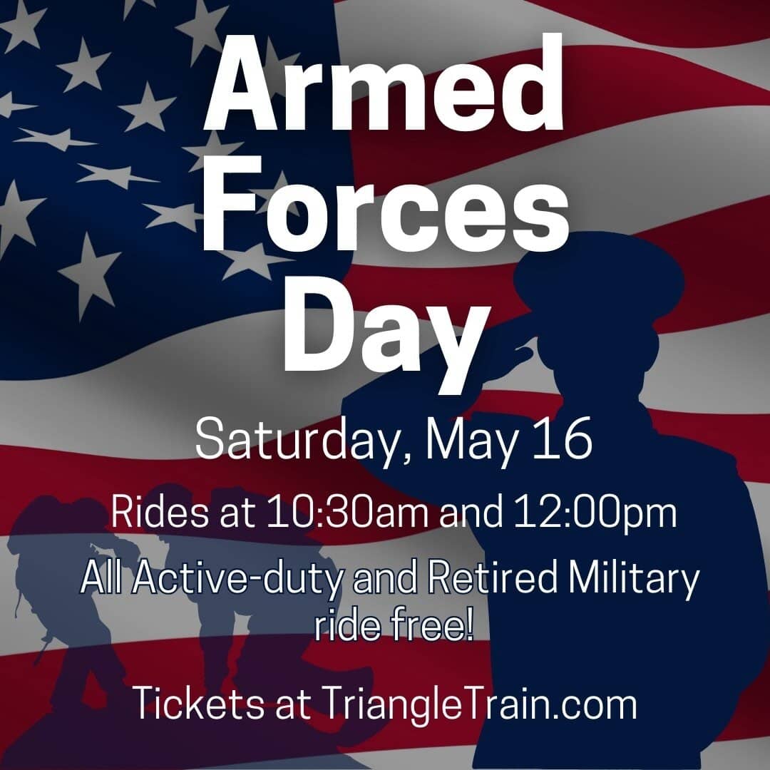 Triangle’s Train: New Hope Valley Railway, 3900 Bonsal Road, New Hill, North Carolina, is offering free train rides to military service members on Armed Forces Day, Saturday, May 16, 2026.