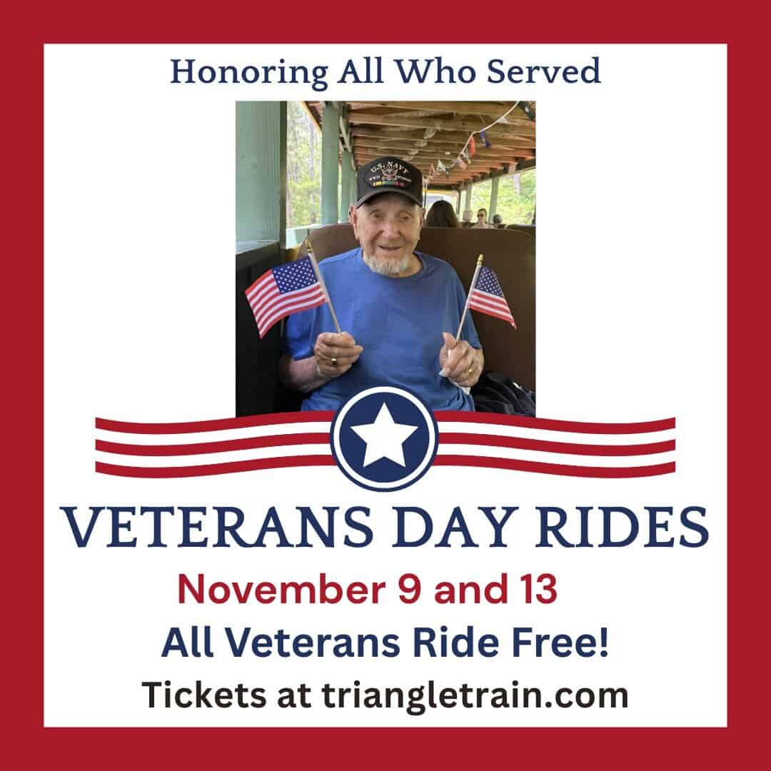 Triangle’s Train: New Hope Valley Railway, 3900 Bonsal Road, New Hill, North Carolina, is offering free train rides to military service members for Veterans Day.