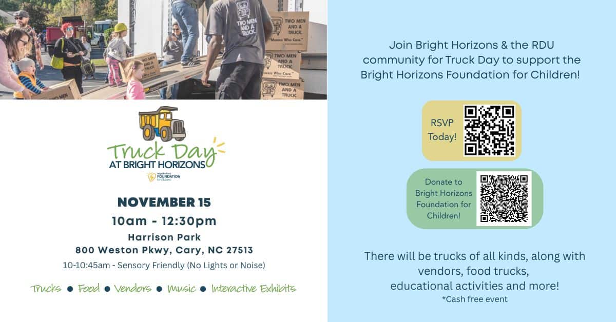 Bright Horizons, at 800 Weston Parkway, Cary, North Carolina, is hosting Truck Day on Saturday, November 15, 2025, from 10 a.m. to 12:30 p.m.