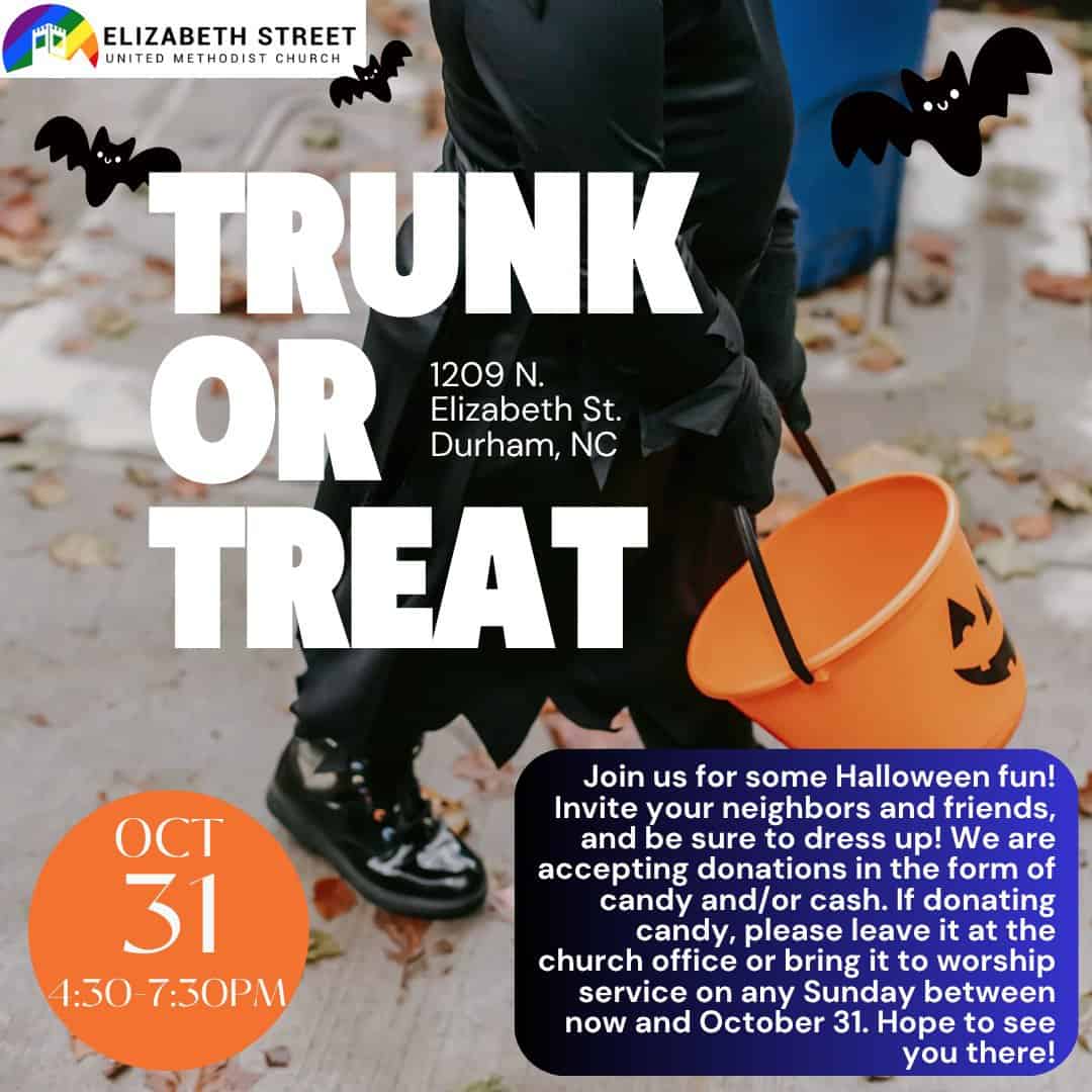 Elizabeth Street UMC, 1209 N Elizabeth Street, Durham, North Carolina, is hosting a Trunk or Treat for the community on Friday, October 31, 2025, from 4:30 to 7:30 p.m.