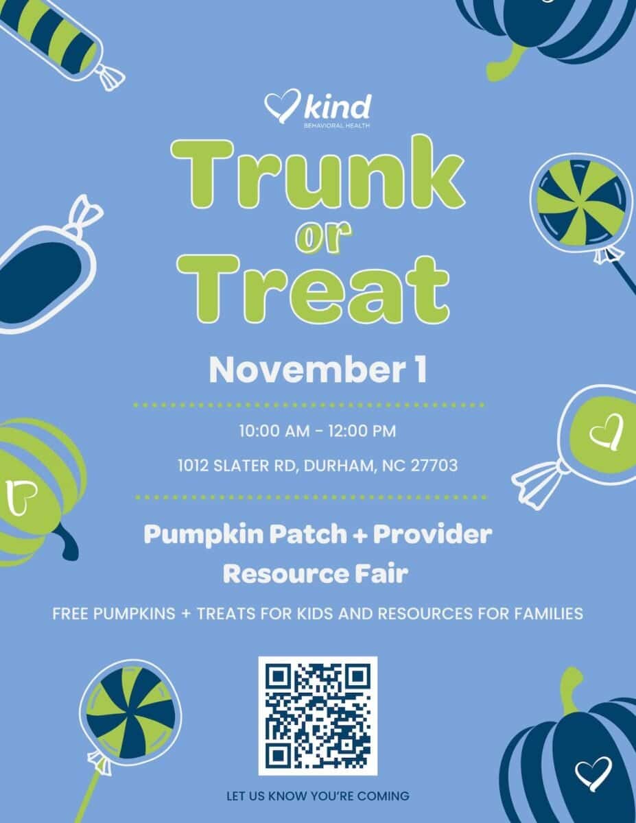 Kind Behavioral Health, 1012 Slater Road, Durham, North Carolina, is hosting a Trunk or Treat event on Saturday, November 1, 2025, from 10 a.m. to 12 p.m.
