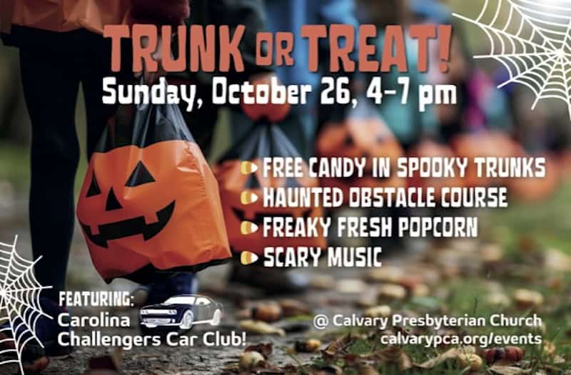 Calvary Presbyterian Church, 6520 Ray Road, Raleigh, North Carolina, is hosting a Neighborhood Trunk or Treat on Sunday, October 26, 2025, from 4 to 7 p.m.