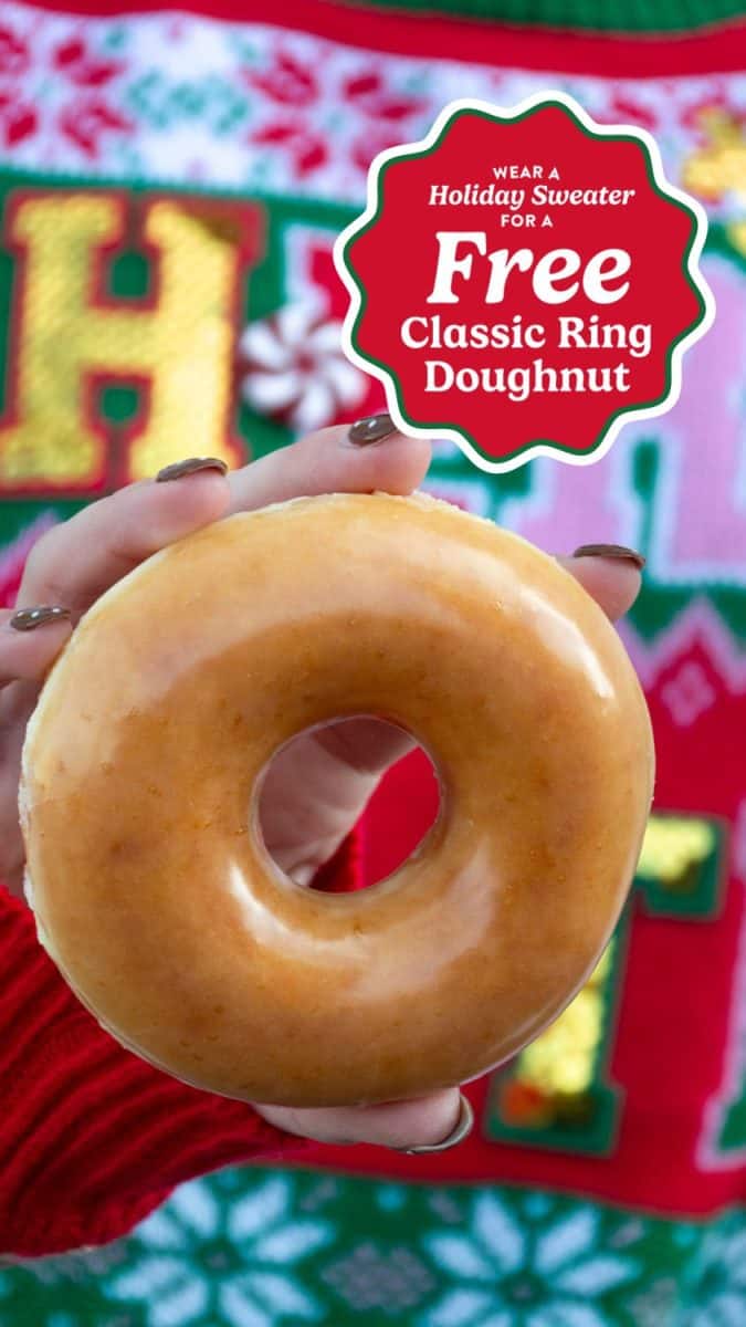 On December 19, 2025, Krispy Kreme is giving any customer wearing a holiday sweater a FREE Original Glazed or Classic Assorted Ring Doughnut at participating locations. No purchase necessary.