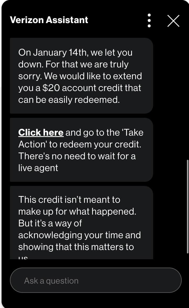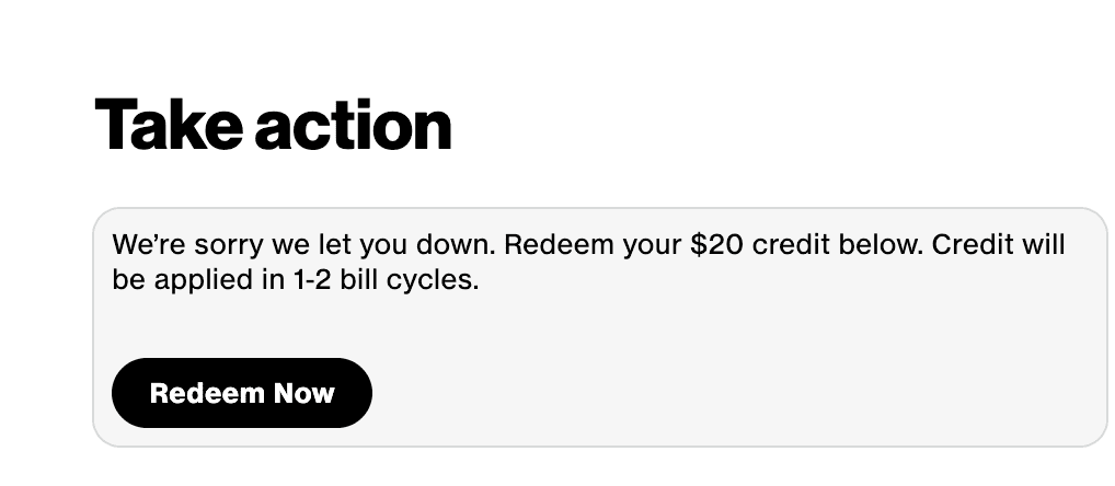 Verizon is offering a $20 credit on the bills of customers who were affected by the outage, but the catch is that you have to redeem the credit. Perhaps the motivation is that many people will not take the steps to claim the $20 credit.