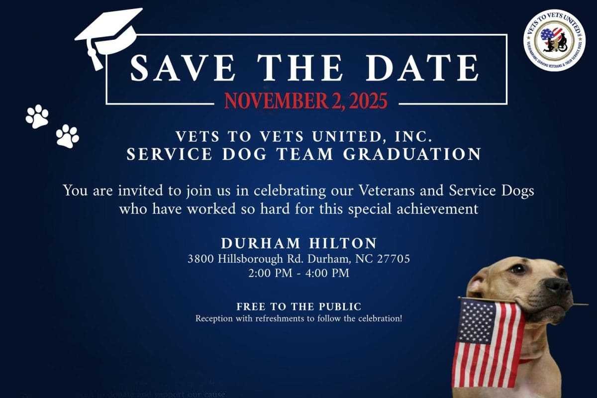 Celebrate the accomplishments of some very special students, at the Vets to Vets Service Dog Team Graduation, on Sunday, November 2, 2025, from 2 to 4 p.m., at Hilton Durham, near Duke, at 3800 Hillsborough Road, Durham, North Carolina.
