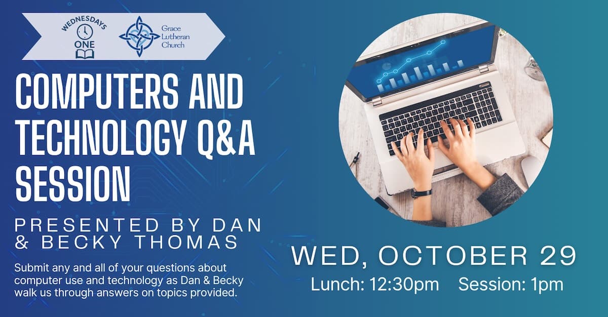 Grace Lutheran Church, 824 N Buchanan Blvd, Durham, North Carolina, is hosting Wednesdays at One: Computers & Technology Q&A Session on Wednesday, October 29, 2025.
