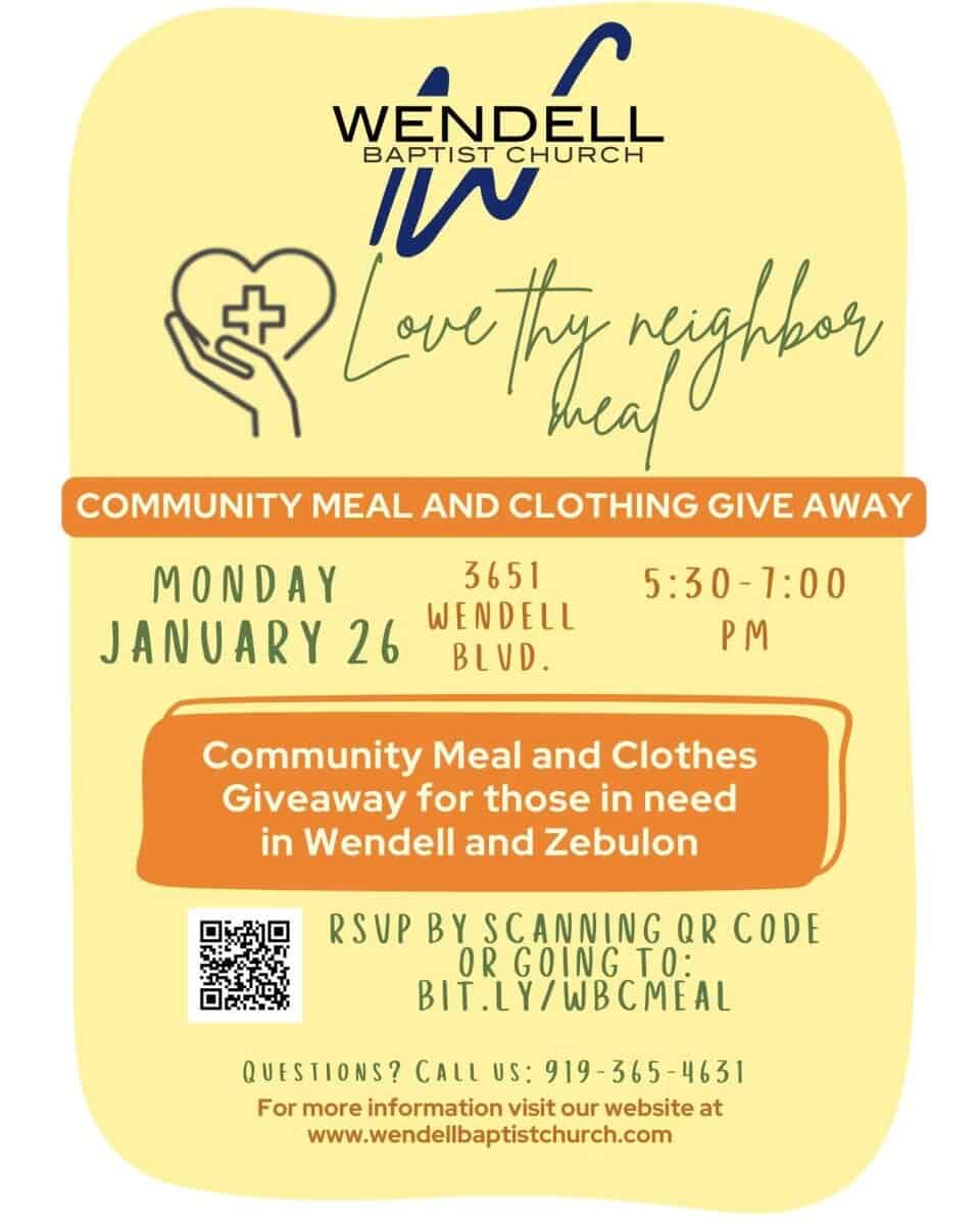 Wendell Baptist Church, 3651 Wendell Blvd, Wendell, North Carolina, is hosting “Love Thy Neighbor,” a free community meal and clothing giveaway, on Monday, January 26, 2026, from 5:30 to 7 p.m.