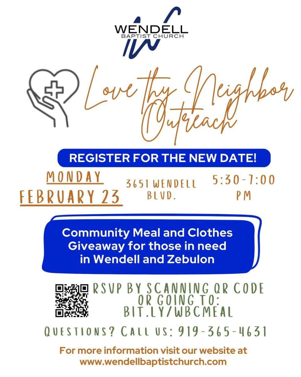 Wendell Baptist Church, 3651 Wendell Blvd, Wendell, North Carolina, is hosting “Love Thy Neighbor,” a free community meal and clothing giveaway, on Monday, February 23, 2026, from 5:30 to 7 p.m. This is a rescheduled date.